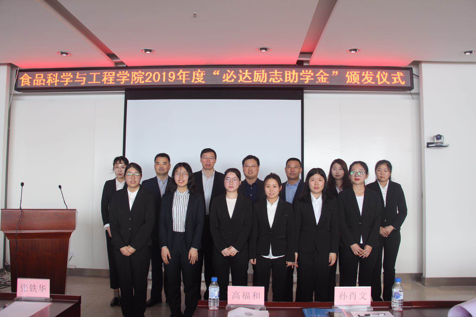 2019年5月9日,食品科学与工程学院在西区图书馆三楼报告厅举行2019年度“必达励志助学金”颁奖仪式,学院党委书记高福和、院长张铁华,必达集体副总经理孙肖文出席会议。会议由学院党委副书记梅士伟主持。