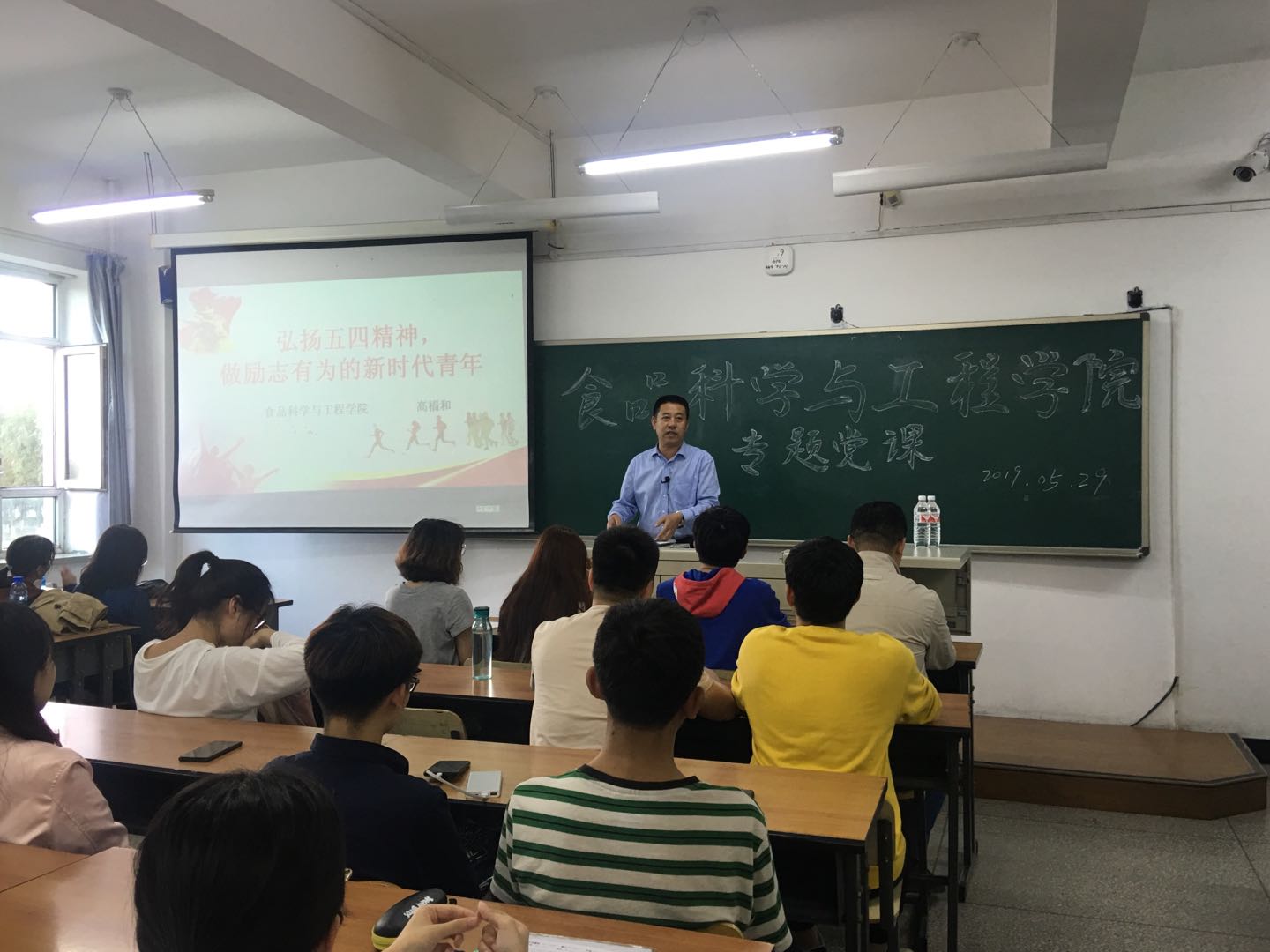 学习新思想,争做新青年。为深入学习习近平总书记在纪念五四运动100周年大会上的重要讲话精神,2019年5月29日,食品科学与工程学院在科学讲堂201教室举办学习活动,学院党委书记高福和以“弘扬五四精神,做励志有为的新时代青年”为主题,为学生党员讲授专题党课。学院党委副书记梅士伟、学生党支部书记郝慧,全体研究生党员、本科生党员和积极分子参加了党课学习。