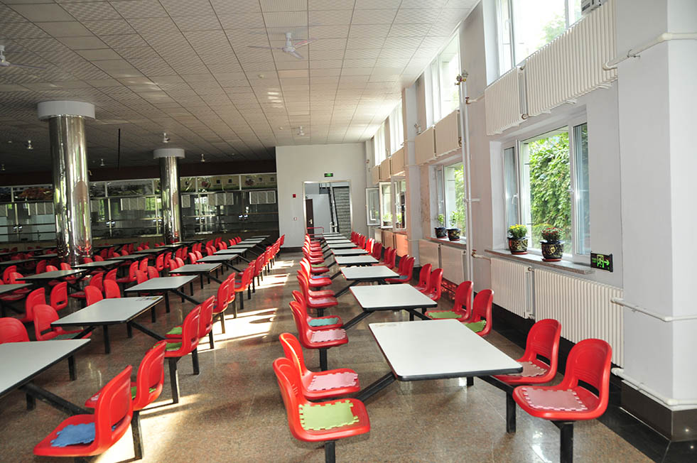 为体现以人为本的理念,在功能需求方面,在一层大厅增设卫生间及微机室,为学生就近存卡及如厕洗手创造便利条件,升级改造了淋浴间,增设了热水器,为后厨员工洗浴创造便利条件;为满足各种功能需求,增设了白钢水箱及白钢储物架,保证了干净、卫生,并对北侧门厅及东侧门厅进行了升级改造,扩宽了门口,增设了旋转门,可满足冬季正常通行,以便封闭北门,从而更好地保证了大厅室温;在保障工程质量及效果方面,选用优质品牌、环保材料,施工后并进行了室内甲醛检测,以确保学生用餐环境健康、清馨;从节约成本、留存原立面效果角度出发,保留原屋面砼挑檐,顶面做找坡及防水处理,外侧做质感漆施工效果良好;考虑到卫生间环境潮湿、使用频率高等特点,采用防水防潮金属隔断;基于美观、保养等多方面因素考虑,后厨吊顶采用铝扣板材料,更易于维修、保养。为体现环境育人功能,大厅吊顶采用两种图案板材拼花设计,灯具、吊扇等按板材拼花位置点缀安装,大厅柱子上部增设变色灯箱,档口上部设置了校园风景照片,彰显校园朝气蓬勃、生生不息。