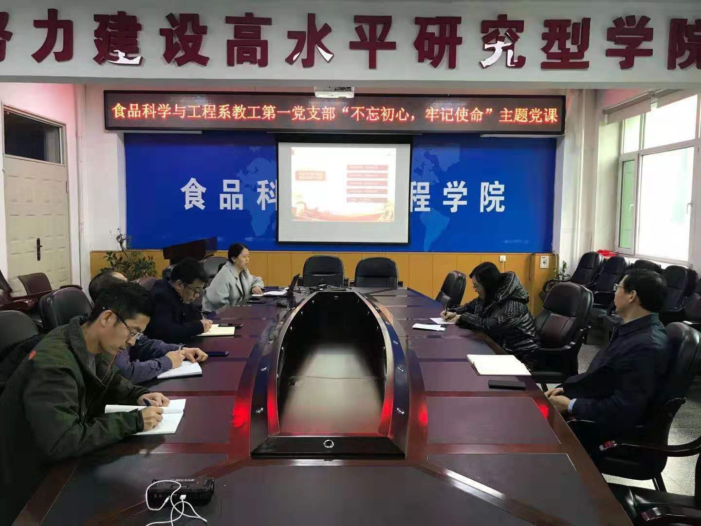 根据“不忘初心、牢记使命”主题教育工作部署安排和“样板支部”年度工作计划安排,食品科学与工程系教工第一党支部于 2019年11月13日上午10点食品楼会议室,开展了“不忘初心,牢记使命”主题党课。参加人6人。