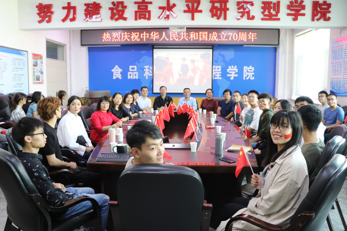 2019年10月1日,食品科学与工程学院组织学院师生在食品楼三楼会议室集体观看庆祝中华人民共和国成立70周年大会、阅兵式直播。学院领导班子成员、党委委员、党支部书记、全体管理干部、教师和学生代表参加了此次会议。