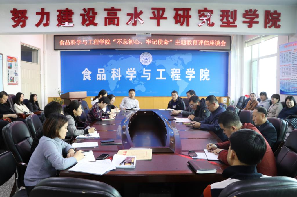 2019年11月26日,食品科学与工程学院在食品楼三楼会议室召开了“不忘初心、牢记使命”主题教育评估座谈会.学院领导班子成员、党委委员、纪委委员、党支部书记、各系、办、中心主任、教师代表及学生代表等30余人参加了会议。学校主题教育第五指导组组长刘雪峰同志莅临指导并主持会议。