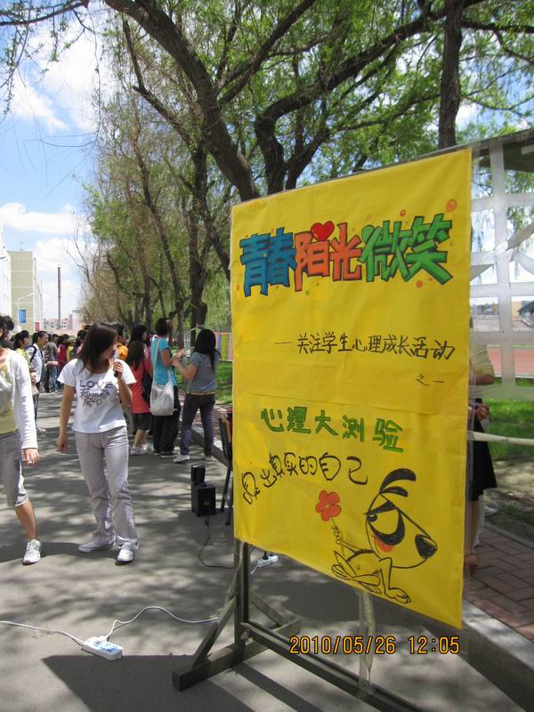 5月26日中午,以“嗅出真实的自己”为题的心理大测验环节在5号公寓门前举行。本次心理测验环节将题目写在按顺序排列的彩色纸板上,并将最后结果以海报形式公布。将原本静态、个人参与的心理测试扩展成为动态、适合更广泛人群进行的活动,形式新颖,立即吸引了许多同学参与进来,他们纷纷驻足,饶有兴趣的做纸板上的问题,根据自己每一个选项答案的指引进入下一题,一直到得出最终的测试结果,在海报上留下自己的涂鸦和手掌印。