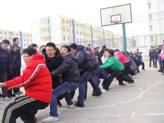 他们的口号如此响亮,他们的动作如此卖力。虽然寒风凛冽,却熄灭不了同学们的热情,阻挡不住大家对胜利的渴望,每一张冻得通红的脸上都洋溢着激动的笑容。有几位班主任老师也亲临现场,参与其中,与同学们并肩作战。比赛一直紧张而有序地进行着,每一名参赛者都全神贯注,努力使出全身力量;每一名观众都情绪高涨,呐喊声回荡在整个校园。为一个人都在自己的位子上,为这项集体的荣誉而奋斗着…经过第一轮、第二轮激烈的角逐,共有4支队伍脱颖而出,进入了决赛。决赛的赛场边聚集了许多的观众,比赛还未开始,加油的口号就响彻天空,每个人都在为自己心中的强队加油助威。选手们更是激动而紧张,紧紧握住绳子,等待着那振奋人心的一刻。一声哨响,每个人都奋力的拉着绳子,有的同学甚至都已跪倒在地,但仍不忘紧紧的抓住手中绳子。在场的所有观众,都被深深地震撼了。