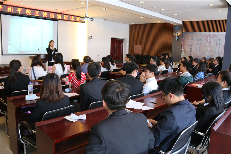 为加强诚信教育,引导学生守诚信, 2015年5月23日星期六下午,由和平校区学生社团联合会举办的“守诚言信自芳馨,秉诚持信行终恒”诚信演讲比赛决赛于图书馆三楼会议室举行。马克思主义学院教授付秀荣、西区学生办公室主任邵俊涛、西区团工委副书记梅娜、和平校区第九届学生社团联合会主席团成员出席活动并担任评委。