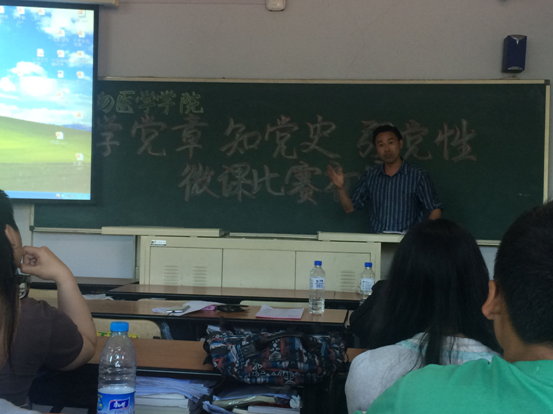 红心向党,祝福祖国!2015年6月3日下午1时,科学讲堂203教室里举行了动物医学学院首届“学党章•知党史•强党性”微课比赛的初赛。动物医学学院党委副书记饶家辉、辅导员董兵、辅导员谭瑶出席本次比赛并担任评委。动物医学学院21名党员和预备党员参加了此次初赛。
