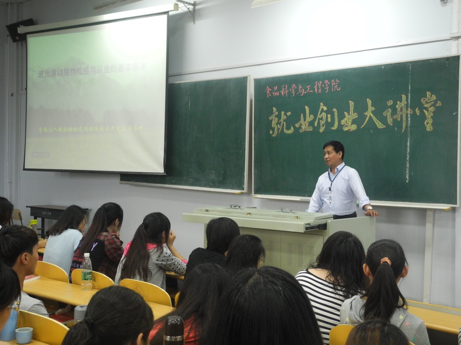 为了使同学们进一步了解学院专业就业前景,明确未来规划,鼓励自主创业,2015年9月9日下午三点半,食品科学与工程学院在科学讲堂300教室举办了就业创业指导大讲堂。本次讲座邀请了吉林出入境检验检疫局经济技术开发区办事处主任石建平作为主讲人。食品科学与工程学院党委副书记梅士伟、学院潘风光教授以及学院全体学生参加了此次讲座。