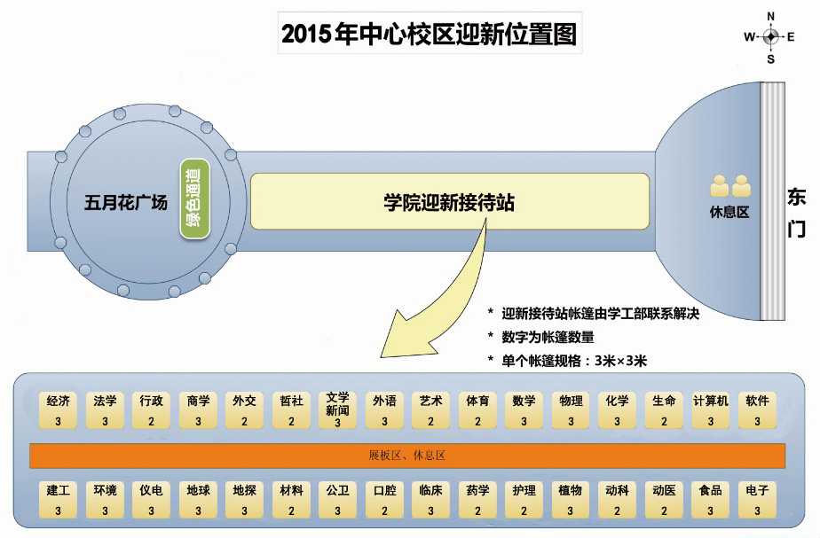 3.中心校区迎新用帐篷(3米×3米)由学工部统一协调,于8月27日晚提前布置完毕。请各学院按照标示的帐篷数量及现场标识确认本学院迎新地点,迎新位置图请见附件。