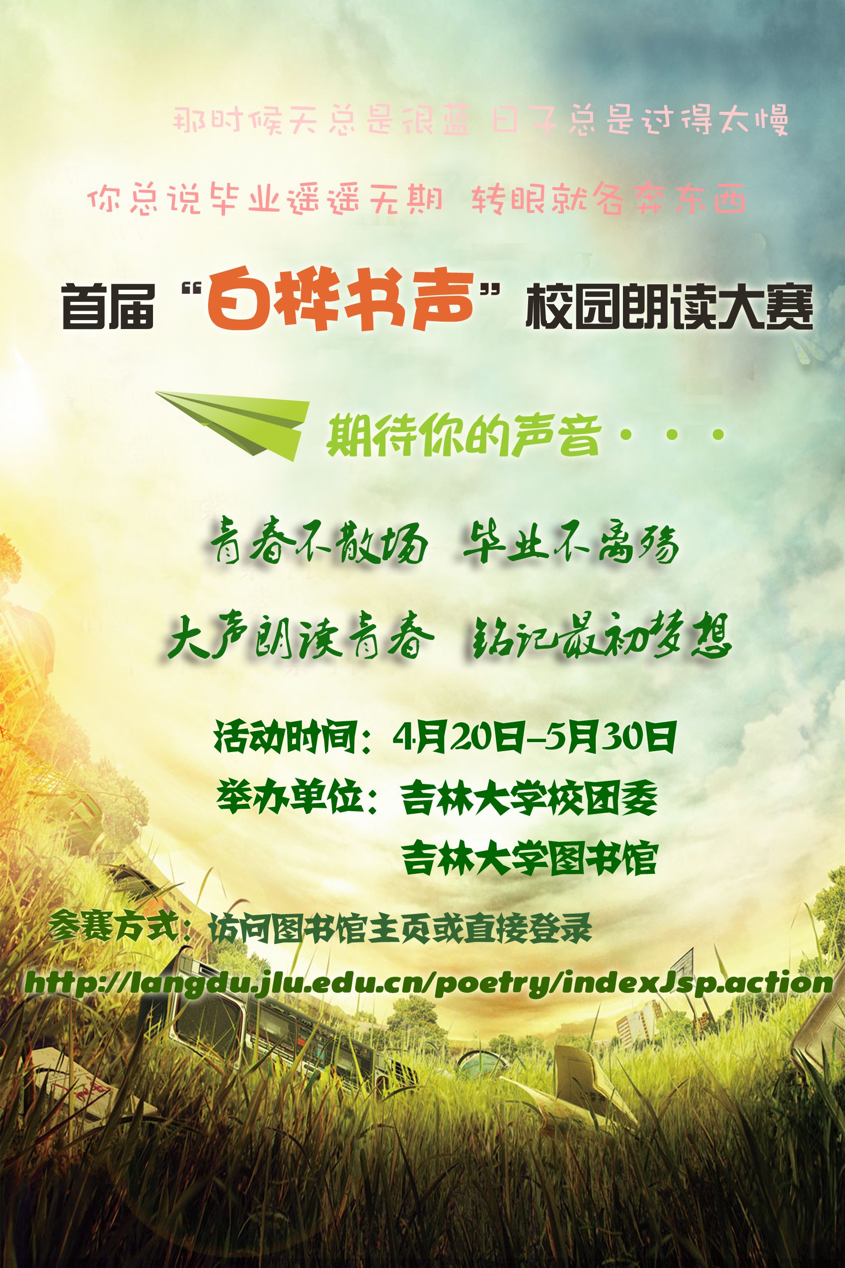 3 内容:为充分发挥图书馆校园文化中心的作用,倡导“经典阅读”和“价值阅读”的阅读方式,营造“全民阅读”的校园文化氛围,校团委联合图书馆于2015年4月 20日至5月30日举办首届“白桦书声”校园朗读大赛。作为本次大赛的载体,图书馆将同时推出“白桦书声”网站用以发布展示我校读者朗读的风采。朗读国内外经典名著片段、诗歌、散文,也可朗读自己的原创作品,将朗读的音频文件提交至“白桦书声”网站(http://langdu.jlu.edu.cn/poetry/indexJsp.action)。 大赛将在提交作品中评选优秀作品25份,奖品为李元元校长、杨振斌书记签名图书。