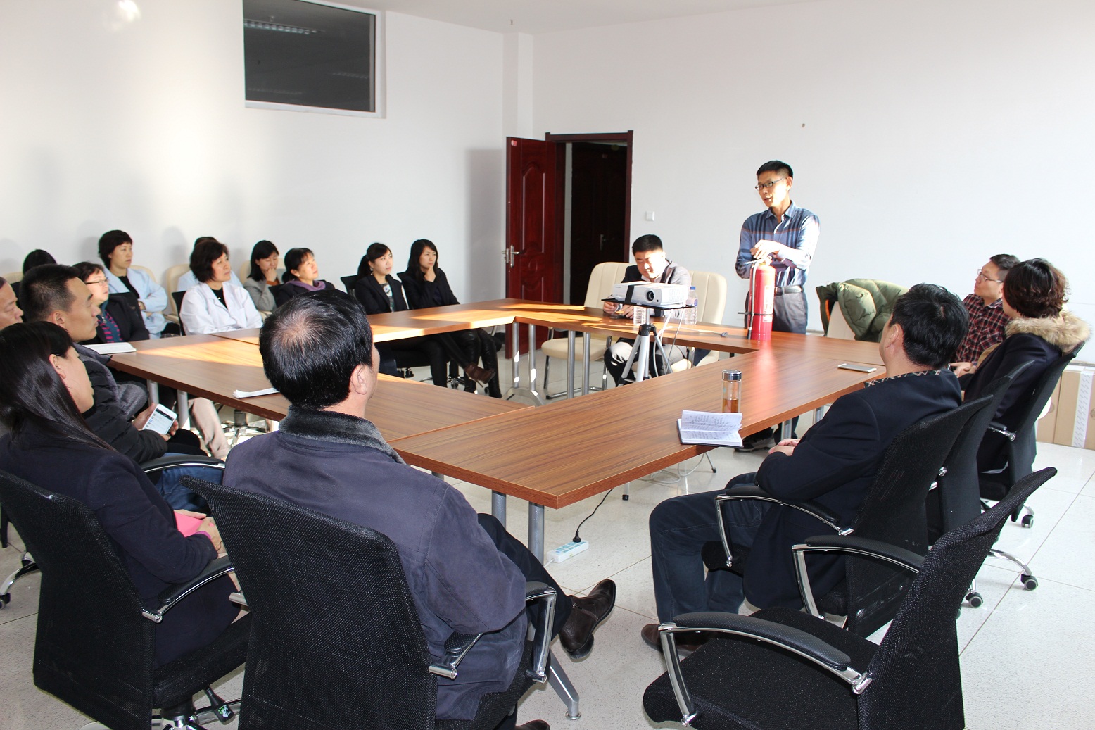 会上胡立文老师从五个方面讲解了工作及日常生活中遇到的消防问题及科学处置方法。包括:消防安全意识的日常养成;遇突发事件时如何第一时间准确、迅速地求助、实施救援和疏散;个人在火灾中的逃生方法,常见消防器材的工作原理及如何使用,了解楼内消防通道、水源及各种灭火器材设备分布的基本状况;生活中开车遇险处置;乘坐电梯遇险处置。在现场以具体实物为例,介绍了常用干粉灭火器的操作使用方法。整场讲座案例丰富,详实生动。