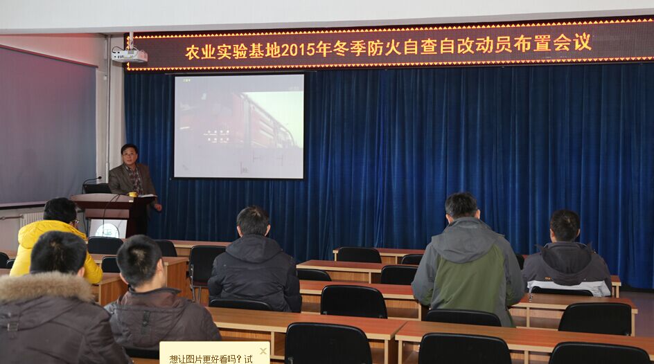12月6日下午,农业实验基地在综合楼1楼会议室召开了2015年冬季防火自查自改动员布置会议,部署基地2015年冬季防火工作。基地党政班子成员、全体教职工和公共及实验场区临时用工等全体人员参加了会议。会议由王文众副主任主持。
