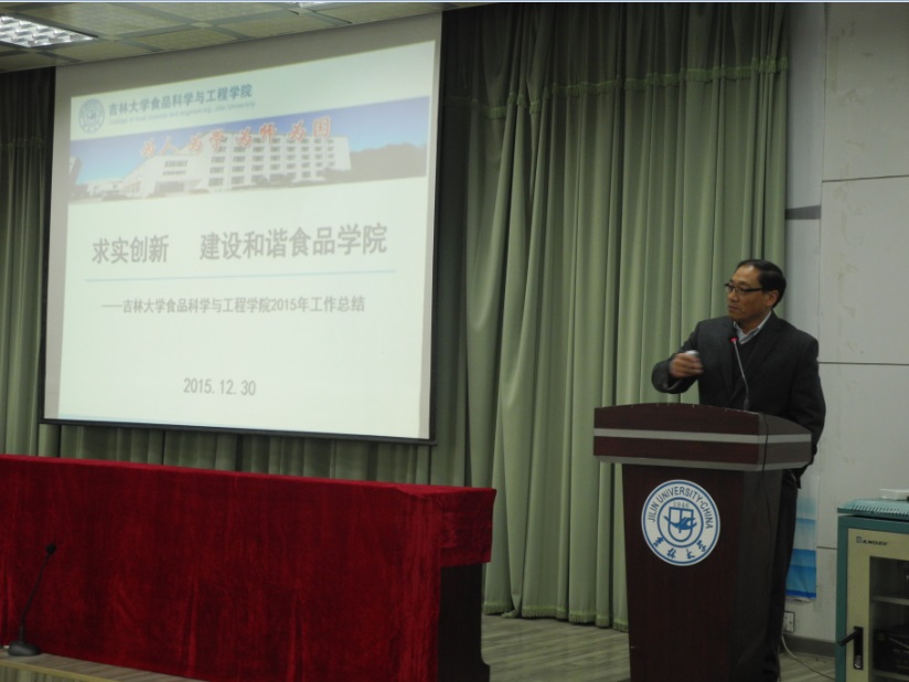 表彰结束后,国家“”特聘教授、院长郭明若以《求实创新,建设和谐食品学院》为题,从学院年度工作回顾、学院现状、学院发展中存在的问题和未来工作目标四个方面,对学院2015年的教学科研工作、学生工作、行政管理工作及学院未来发展做了全面总结。他指出,在食品科学与工程学院新成立的大背景下,学院顺利通过博士点学科评估,学科建设取得新突破;教学工作稳步运行,人才培养不断提升;科研工作扎实推进,科研实力不断增强。他同时强调在未来发展中,要加强学科建设,丰富师资团队,加强人才培养,扩大科学研究。