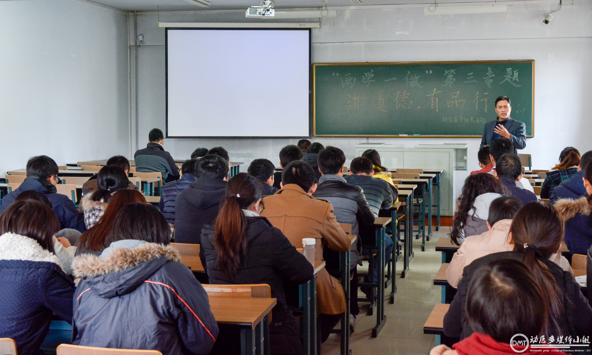 2016年10月31日上午,吉林大学动物医学学院全体研究生党员在兽医楼301开展“‘两学一做’第三专题——讲道德、有品行”系列学习教育实践活动。本次活动由学院党委副书记栾志伟主持,研究生全体党员参加了此次活动。