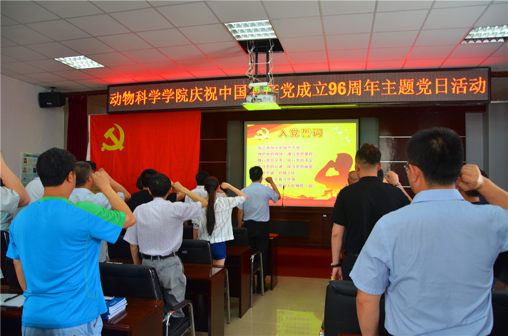 为庆祝中国共产党建党96周年,6月29日下午,动物科学学院举办了庆祝中国共产党成立96周年主题党日活动。学院领导班子及全体党员参加了此次活动,活动由学院党副书记兼纪委书记曹伟光同志主持,此次活动分为党旗下宣誓、“争先创优”表彰和专题学习三个部分。