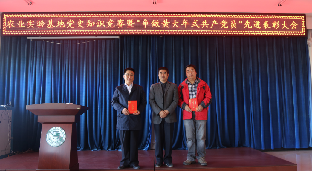 为贯彻落实学校“两学一做”学习教育常态化制度化要求,深入推进“争做黄大年式共产党员”活动开展,喜迎十九大。9月30日上午,农业实验基地全体教职工在综合办公楼一楼会议室隆重集会,组织召开了党史知识竞赛暨“争做黄大年式共产党员”先进表彰大会。