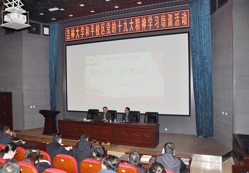 12月5日下午,由校党委组织部、宣传部主办,西区综合办公室承办的“吉林大学和平校区党的十九大精神学习培训活动”在和平校区图书馆报告厅举行。学校“党的十九大精神宣讲团”成员、哲学社会学院白刚教授应邀作了题为《新时代的“中国共产党宣言”——解读党的十九大报告》的辅导报告。