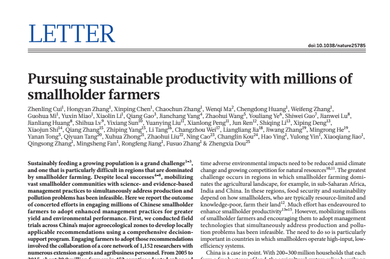 2018年3月8日,国际顶级学术刊物《Nature》在线发表了植物科学学院曹宁副教授参与完成的研究论文《Pursuing Sustainable Productivity with Millions of Smallholder Farmers》(与千百万农民一起实现绿色增产增效)。本研究报道了在过去十年里,与全国2,090万农户一起应用优化的管理技术获得了更高的作物产量,同时也减少了农业生产对环境造成的污染。这是植物科学学院继2015年6月23日学院杨振明教授研究团队在《美国国家科学院院刊》(PNAS)、2016年10月21日学院左泽乘副教授以第一作者身份在《Science》上发表标志性成果以来,取得的又一重大科研成果。