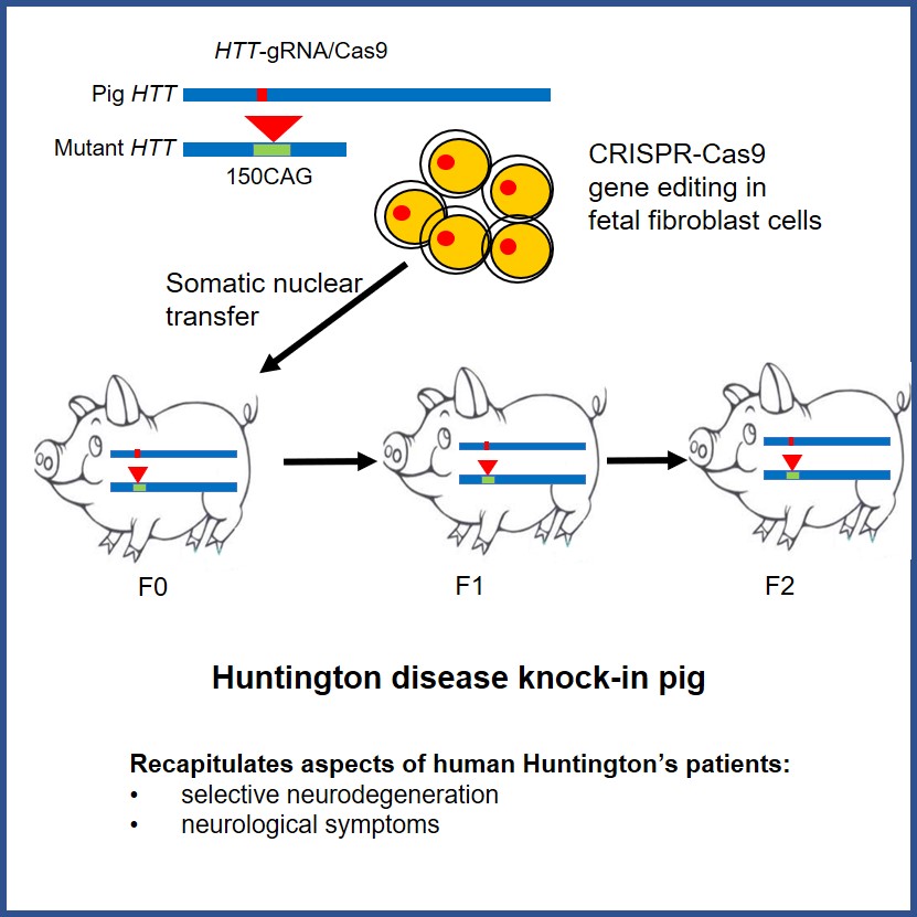 我院赖良学教授与暨南大学李晓江团队经过4年努力,利用CRISPR/Cas9技术和体细胞核移植技术,成功培育出世界首例亨廷顿舞蹈症基因敲入猪,该项成果于北京时间3月30日在线发表在生物学顶尖学术期刊《Cell》上(A Huntingtin Knockin Pig Model Recapitulates Features of Selective Neurodegeneration in Huntington’s Disease,