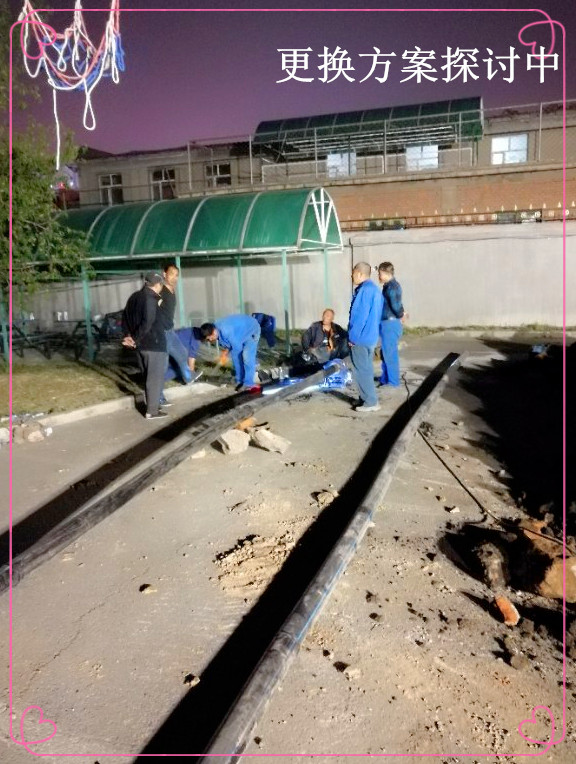 次日上午,李管理员为提高抢修效率,将维修部门各个工种进行合理分工,挖沟、找漏点、准备抢修工具多方面同时作业。由于没有专业的检测仪器,排查工作进展艰难,从家属区周边开始,地下供水管网遍布整个一号院,支管错综复杂,而且深埋地下,要想寻找漏点就要深入地沟进行排查。维修工人不怕脏、不怕累,毅然下到井中,仔细查找漏水点。一天一夜过去了,在地沟里作业的工人已经汗流浃背,却没有人愿意停下来,你累了我下,我累了你来,就这样一处处的排查。经过加压供水,终于在国际交流中心楼下地沟里,发现了有清水流淌,基本确定了漏点位置。此处楼内掩埋管道年久老化已无法修复,于是陈经理果断决策:改变路由,更新管线;加大供水压力,实行间断式供水,保障居民基本生活用水。