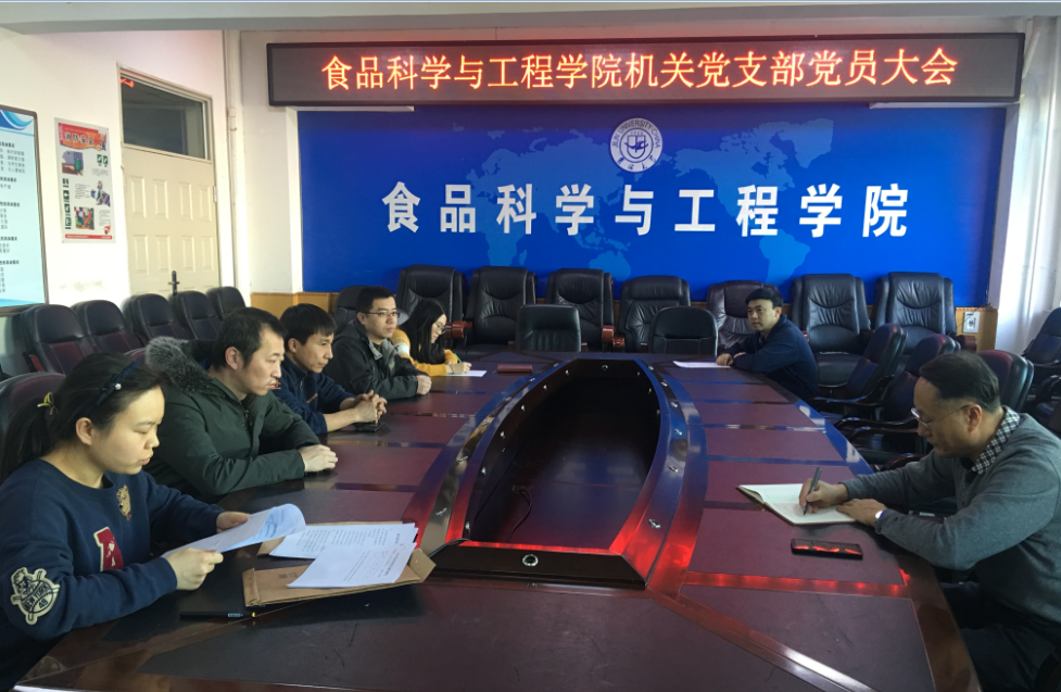 2019年1月9日下午,食品科学与工程学院机关党支部换届大会在食品楼三楼会议室召开,机关党支部全体党员参加了会议。会议由党支部书记马爽同志主持。