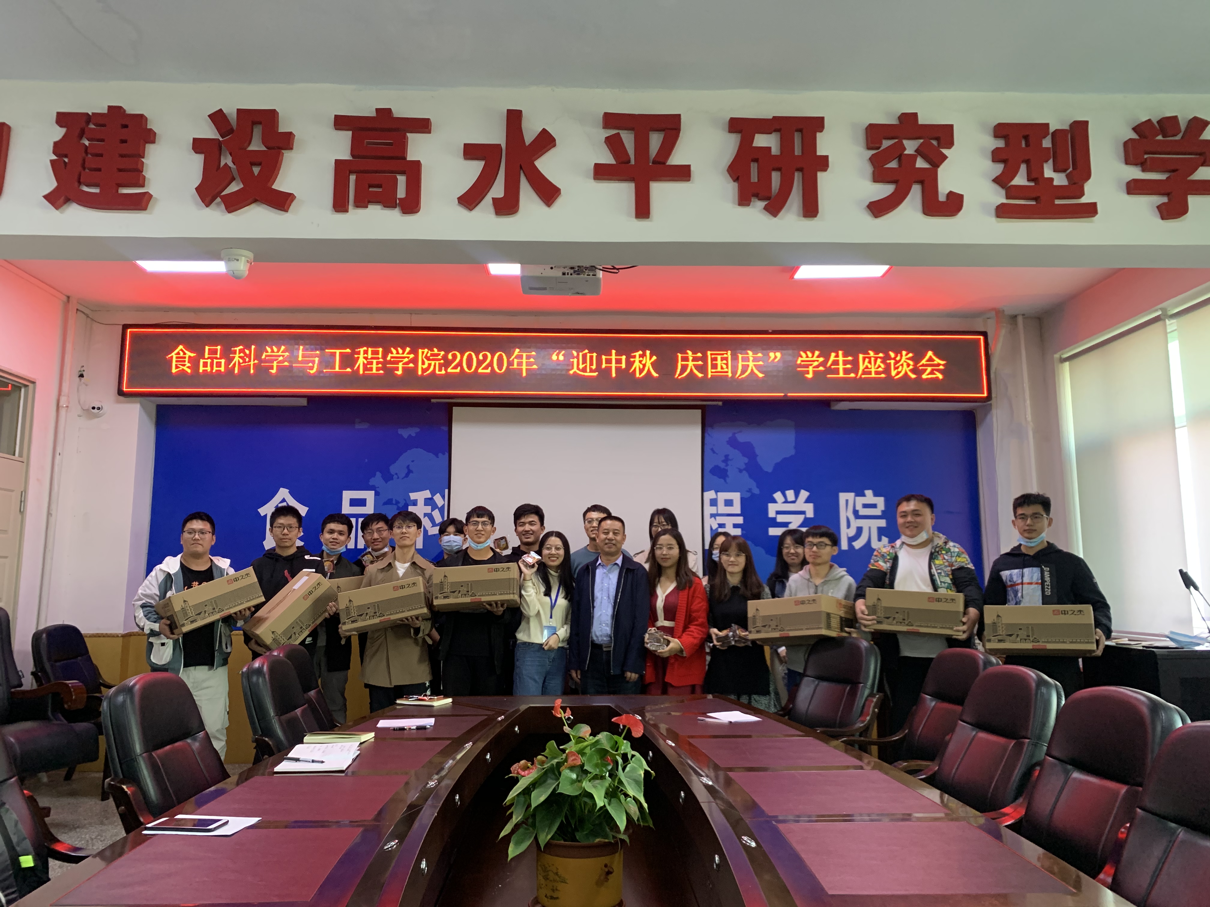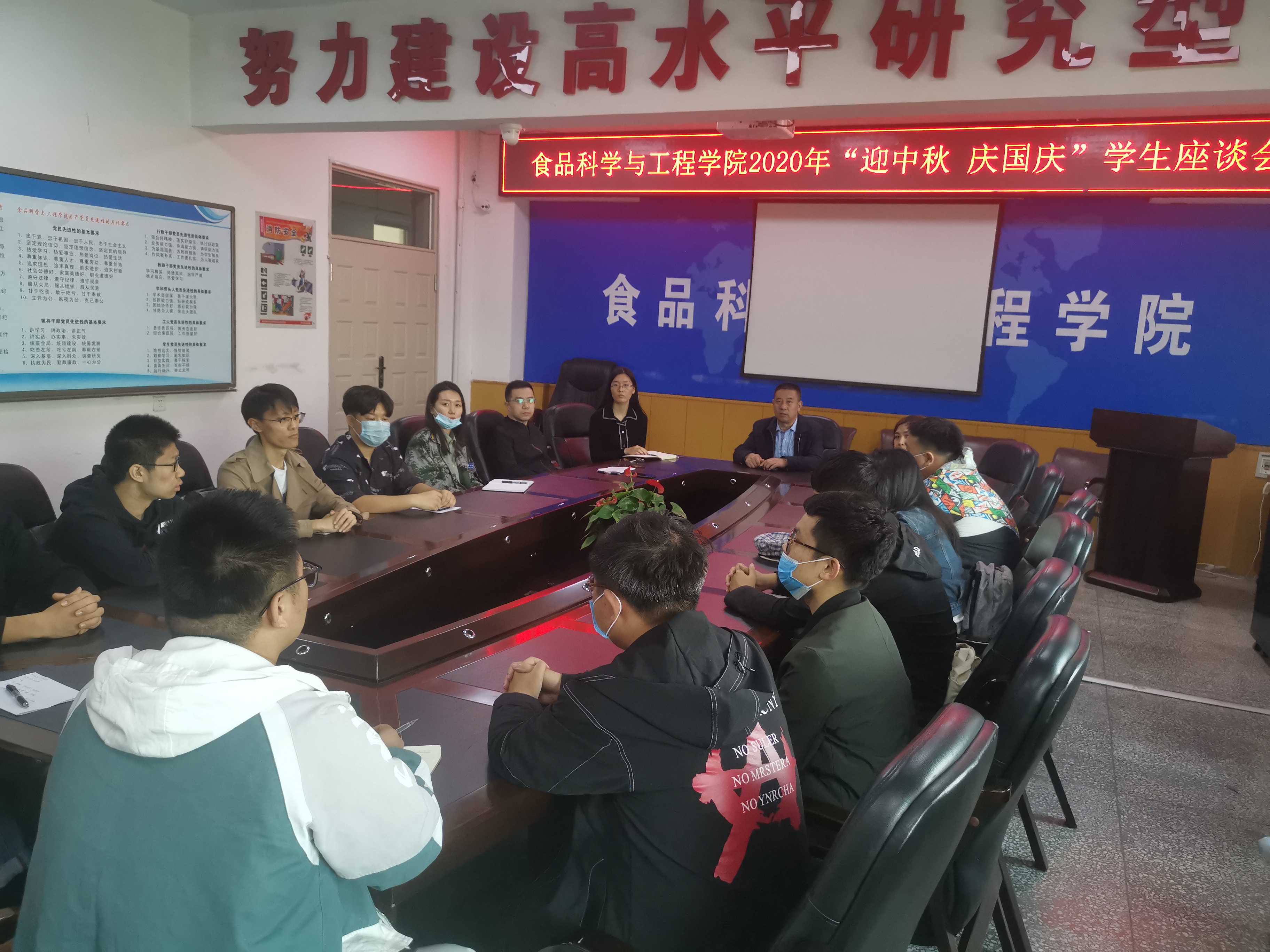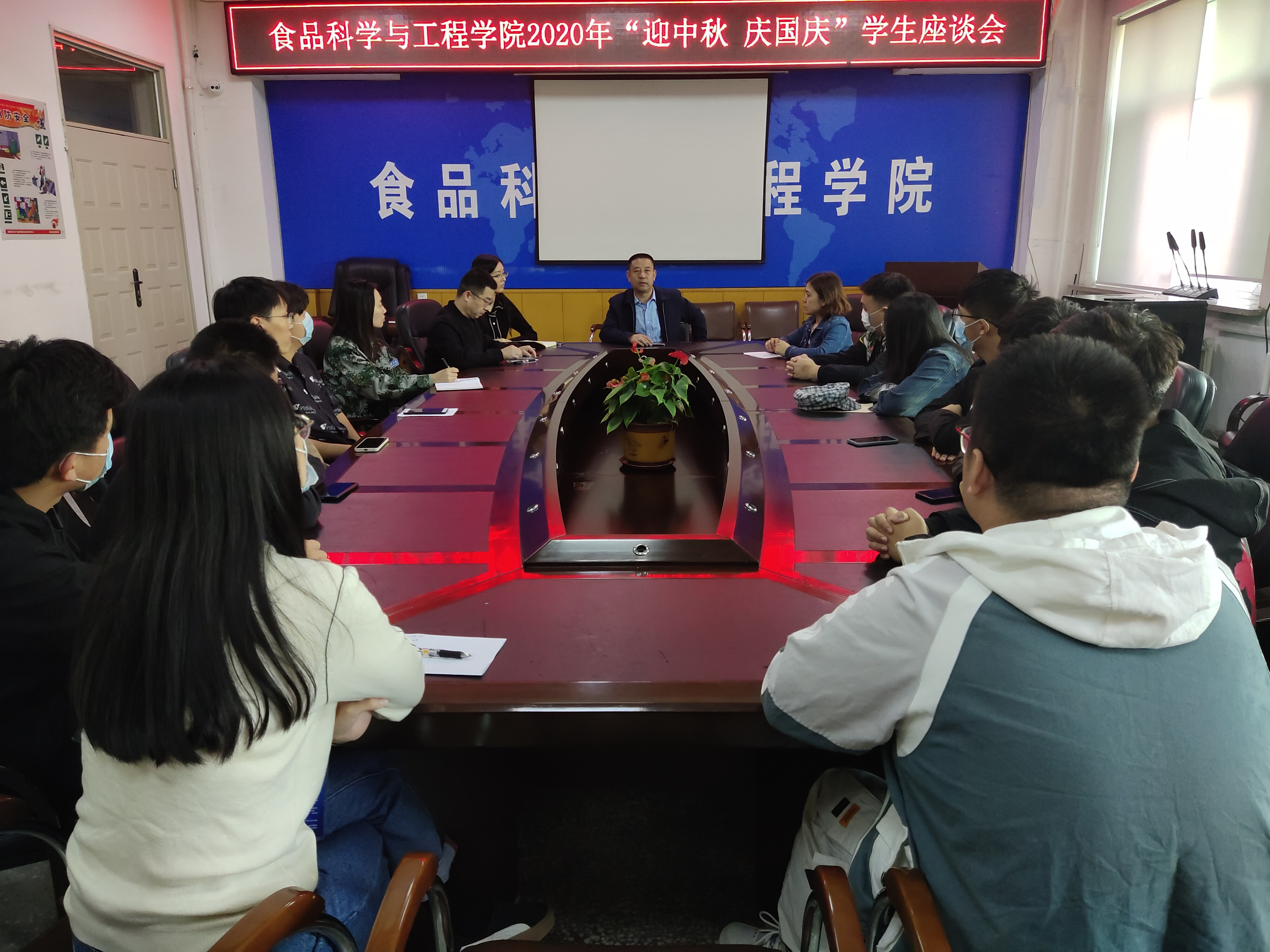 双节将至,为了使在校学生感受节日气氛,加强“十一”假期安全教育,2020年9月30日14时食品科学与工程学院在食品楼三楼会议室召开“迎中秋,庆国庆”学生座谈会。学院党委书记高福和、研究生办公室主任王军、学生工作办公室主任郝慧、辅导员王新欣、李沁园及研究生、本科生代表参加了会议。