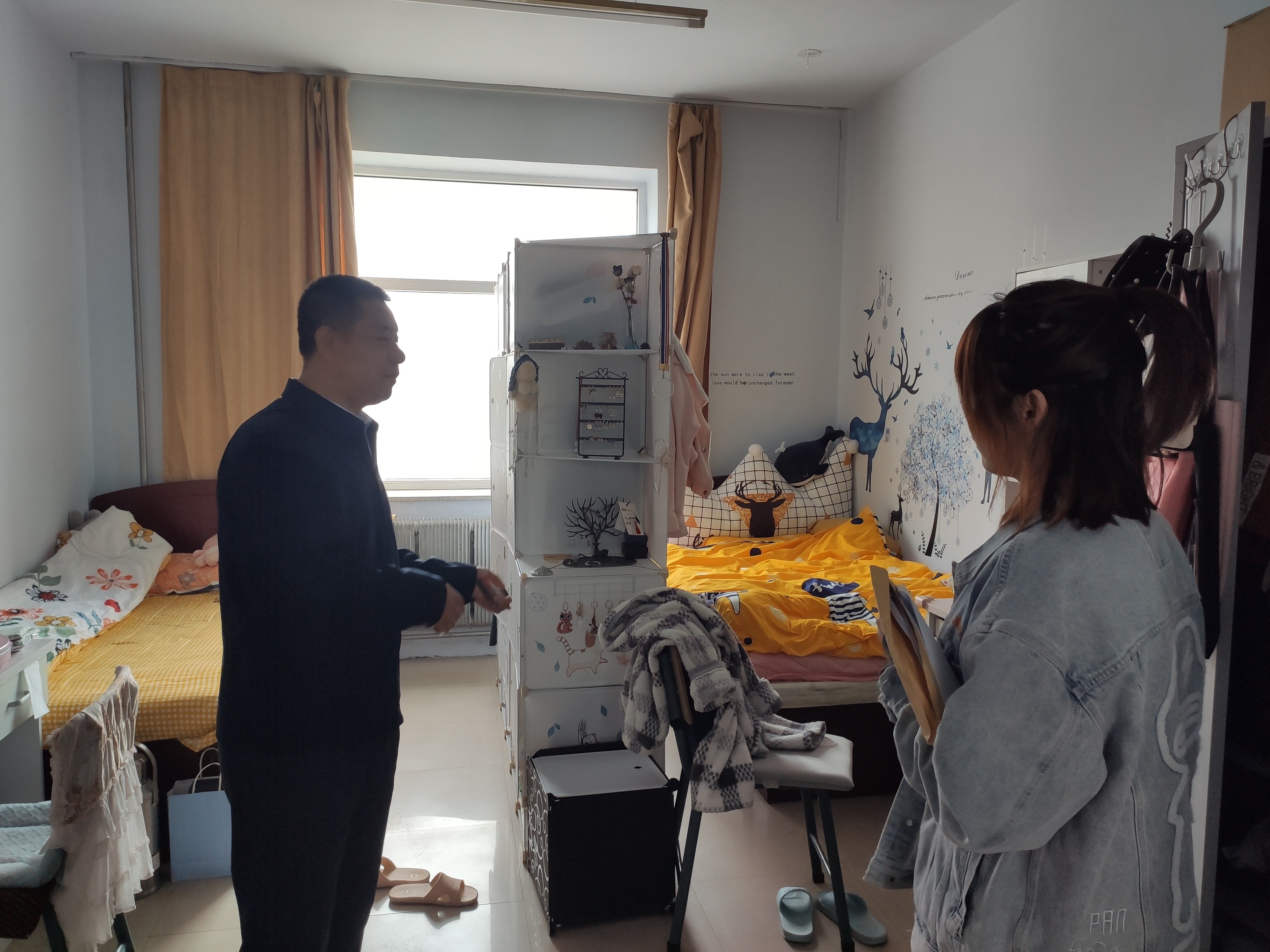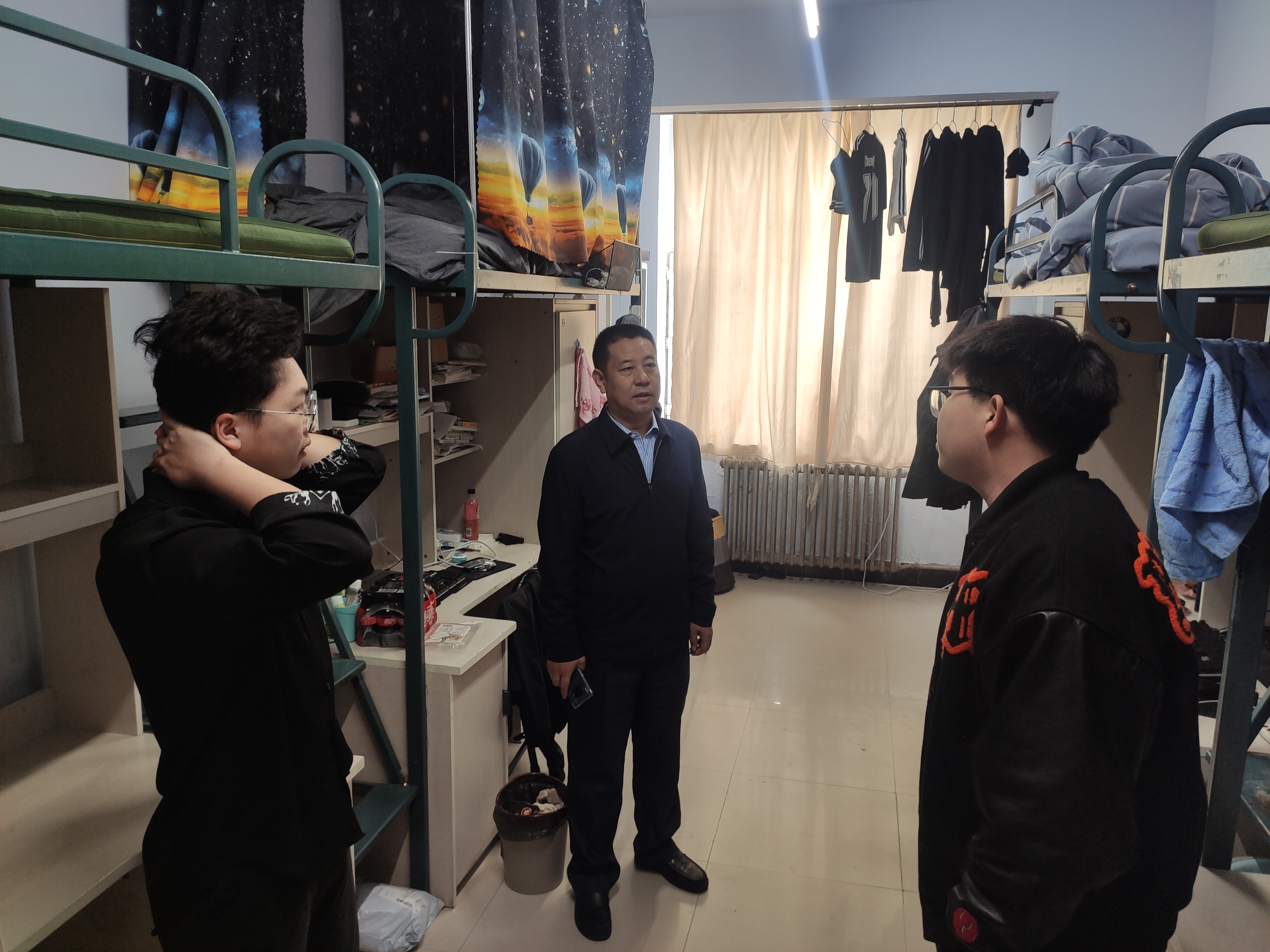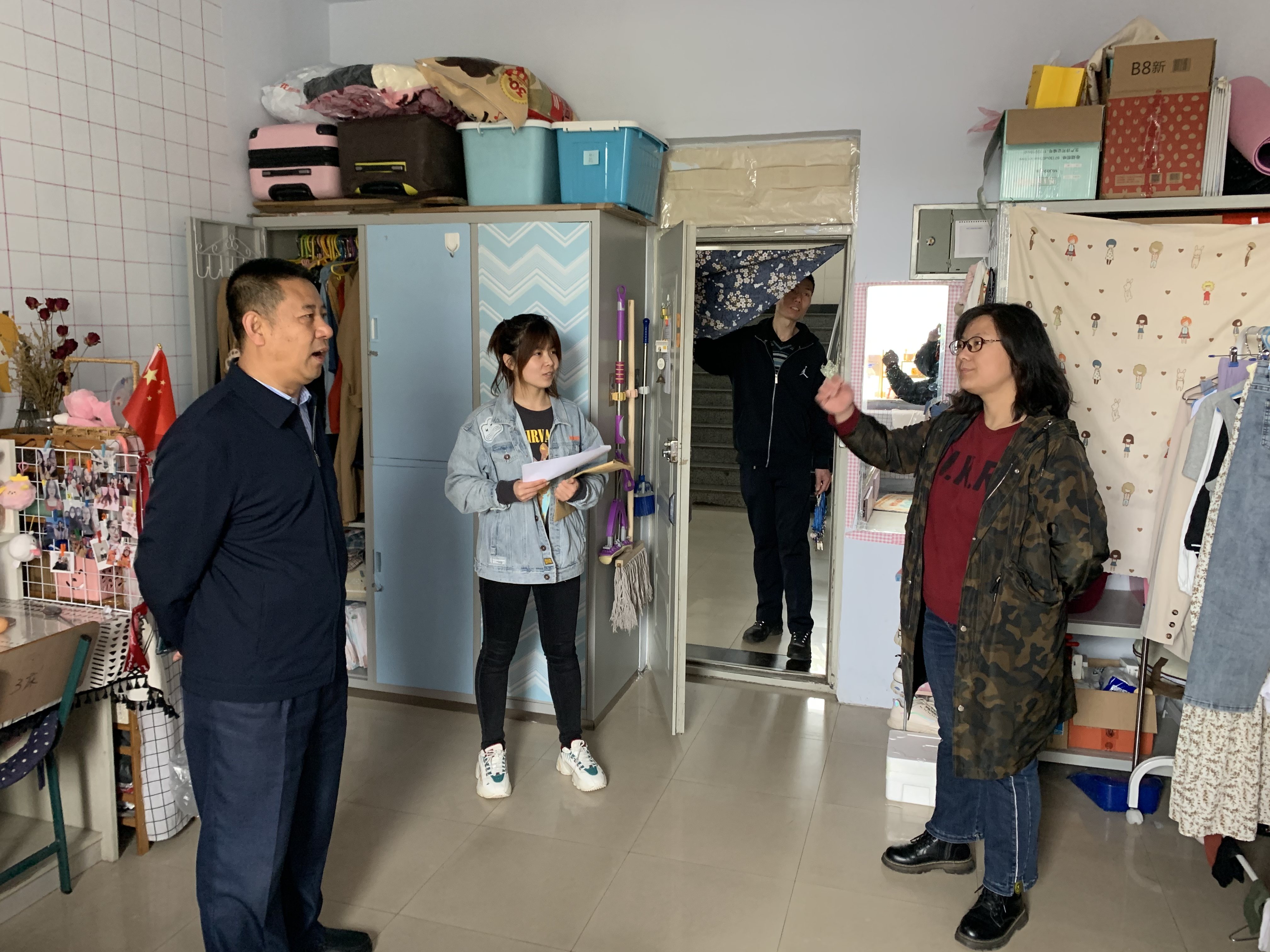 学生寝室检查主要是查看学生寝室是否有乱拉电线、寝室卫生以及违规使用大功率用电器等现象发生。高福和书记在检查过程中对不符合安全要求的地方进行了具体指导并提出解决措施,对五一之后开展学生劳动养成工作提出了要求。