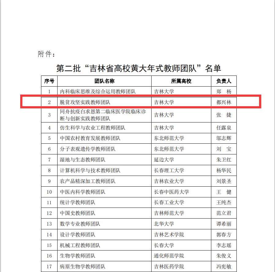 此次吉林省教育厅共认定22个团队为“吉林省高校黄大年式教师团队”,植物科学学院院长都兴林教授带领的“脱贫攻坚实践教师团队”成功入选。