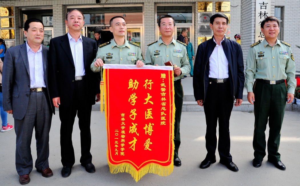 9月6日上午9时许,农学部党工委书记杨振明教授和植物科学学院王彦清书记将一面锦旗赠送给武警吉林省总队医院,上书“行大医博爱,助学子成才”。武警吉林省总队医院政治委员李爱辉说:“践行群众路线的根本是为民,为贫困学子排忧解难是题中之义,是我们军人应有的社会责任。我想,吉林大学植物科学学院和我们医院这次共同的善举,只是一个美好的开端,今后我们两家将在培养优秀大学生的领域里开展更加广泛地合作,做更多的善事好事,立德树人,大医博爱。”