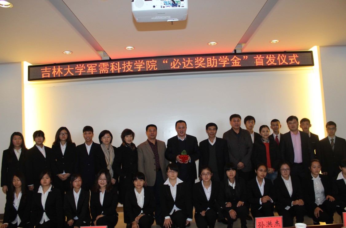 会上,军需科技学院高福和书记首先致欢迎辞;军需科技学院副院长张梅宣读了获得2013年“必达励志奖、助学金”的学生名单;必达控股集团董事长孙洪杰、吉林大学农学部党工委副书记李胜杰共同为20位获奖学生颁发奖学金证书。受助学生代表崔尧上台发言,向必达集团表达了感激之情。