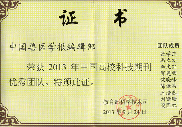 《中国兽医学报》编辑部(张学东,冯立文,郭建顺,沈晓峰,李文红,陈傲第,王浩然,刘珊珊,梁国红)由于近年来团结协作,开拓创新取得了优异成绩而获得优秀团队奖。《高等学校化学学报》、《吉林大学学报》(工学版)也同时获得了该奖,吉林大学以3个期刊获奖位居全国高校之首。《中国兽医学报》编辑部同时还荣获中国高校科技期刊研究会首届“中国高校农业期刊先进集体”称号。