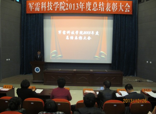 12月26日下午1点20分,军需科技学院2013年工作总结表彰大会在图书馆二楼报告厅隆重召开。学部党工委副书记李胜杰、学院全体教职员工和学生代表出席大会。会议由学院党委副书记梅士伟主持。