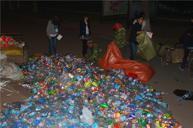 学部学子第一次活动的热情和爱心,让第二次活动有了一个坚实的基础与良好的开端。为了继续给春苗们们奉献一份爱心,他们早早地将废旧饮料瓶、废书纸、废旧衣服积攒起来,并且分类放好,等待着志愿小分队们的到来。同学们积极配合,志愿者欣喜工作,手中的废物虽然沉甸,但想到一个个普通的饮料瓶都承载着同学们爱的力量,一摞摞废旧的纸壳书本都蕴含着小春苗们对知识的渴望,志愿者们还是挽起袖子,迎着皎洁的月光,用我们的爱心小推车把一个个满满的爱心编织袋运回5号公寓。瞬时间爱心之瓶堆满了5号公寓门口,一个个志愿者、一座座小山成为了一道亮丽的风景,不时引来过往同学的驻足观看。