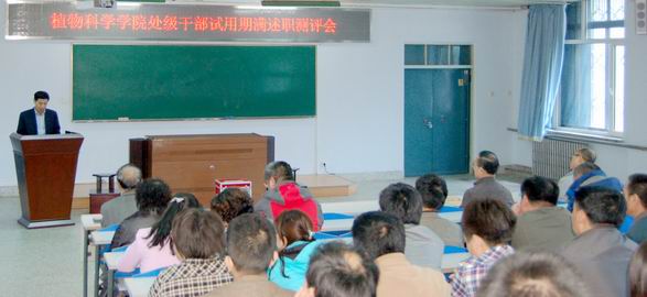 根据《吉林大学处级领导干部任职试用考核办法》有关规定和学部相关工作安排,4月23日下午13:30,植物科学学院在二楼会议室举行了处级领导干部试用期满考核测评会。会议由农学部试用期满处级领导干部考核工作组组长、学部党工委副书记李胜杰主持。学部党工委书记兼院长杨振明教授、学院党委王彦清书记、考核工作组成员张宁处长、樊忠副处长及学院36名相关教职工代表参加了会议。