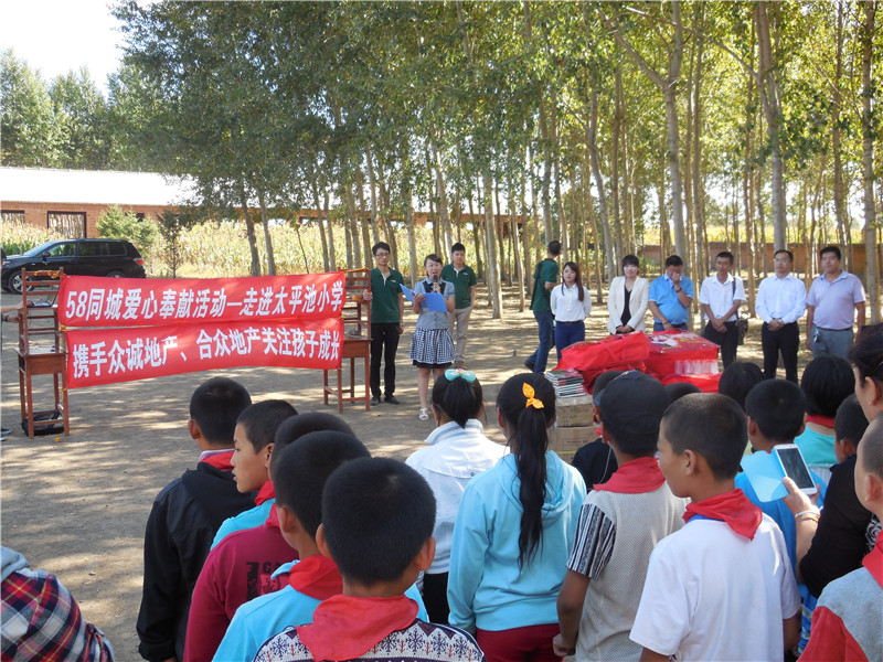 少年智则国智,少年强则国强,少年是国家的希望与发展的动力。为进一步响应团中央号召,培养当代青年的爱心和社会责任感,帮助长春市太平池小学的同学们丰富校园文化生活,改善教学环境,2014年9月11日吉林大学和平校区学生社团联合会携手社会各界爱心人士于长春市龙王乡太平池小学举办了“助春苗,爱奉献——太平池小学捐助活动”。58同城长春分公司总经理张金娟、房产事业部经理马林、众诚地产董事长尹艺凝、总经理孙宇、刘慎武、和平校区学生办公室主任邵俊涛、长春市太平池小学校长徐艳波出席了本次捐助活动。