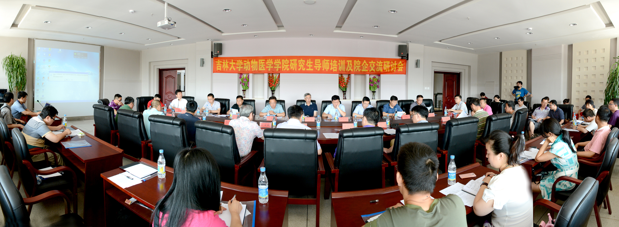 为加强导师队伍建设,增强研究生导师培养水平,深化校企合作,动物医学学院于7月14日上午召开研究生导师培训及院企交流研讨会。会议由主管研究生工作副院长雷连成教授主持,吉林大学研究生培养处处长张宗弢教授、学位办公室主任康永刚教授、农学部学部长和学部学位评定分委员会主席韩文瑜教授、原学部学位评定分委员会主席和校第一届研究生教学督导员王哲教授、学院党委书记张晓楼研究员、常务副院长张西臣教授、主管本科教学工作副院长柳巨雄教授、学科学位评定分委员会主席丁壮教授以及各系主任和研究生导师共50多人参加了会议。会议特邀合作企业:山东省滨州畜牧兽医研究院院长兼书记沈志强研究员、吉林和元生物工程有限公司董事长张中洋先生、辽宁益康生物股份有限公司副总经理王文成博士、广东海大集团研究院副院长王贵平研究员、北京通和生泰比较医学研究所李英俊研究员和烟台金海药业有限公司总经理赵成新先生等6嘉宾出席并进行交流。