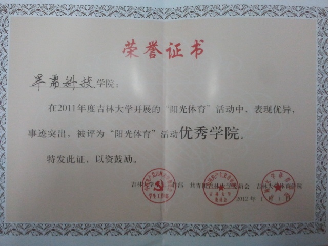 2012年3月15日,经吉林大学学生工作部、共青团吉林大学委员会、吉林大学体育学院联合组成专家评审组对各学院上报的2011年度“阳光体育”活动材料内容认真审核,并根据各学院在2011年“阳光体育”活动中实际取得的成绩,专家组成员商议最终评选出优秀学院20个,优秀辅导员老师29名,优秀学生30名,优秀指导教师8名。其中:军需科技学院获得“阳光体育”群体活动“优秀学院”第一名;张文浩辅导员获得 “优秀辅导员”;负责指导学院 “阳光体育”活动的农学部公共教学中心教师陈春阳老师获得 “优秀指导教师”; 2009级食品质量与安全专业的赵骏倢同学获得“优秀学生”。