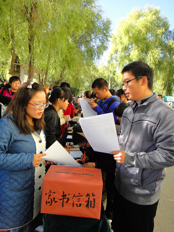 九月九日,眺乡川,归心归望,积风烟。为迎接我国第一个法定“老年节”——重阳节,积极营造尊老、爱老、敬老、助老的和谐氛围,传递在外游子的思乡思亲之情 ,学部滴水青年志愿者协会于2013年10月12日在五号公寓前开展了吉林大学农学部“一封家书”——重阳节寄信归家活动。