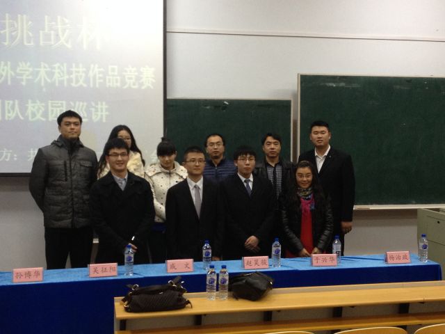 为烘托我校浓厚的科技创新氛围,体会学术创新的趣味,2013年11月7日晚18时,第十三届“挑战杯”全国大学生课外学术科技作品竞赛获奖团队和平校区校园宣讲在科学讲堂100教室隆重举办。学部团委书记邵俊涛,校团委学术部部长魏海成,学部团委秘书郑蕊和第十三届“挑战杯”全国大学生课外学术科技作品竞赛吉林大学“优胜杯”五支获奖团队学生代表出席了本次宣讲大会。