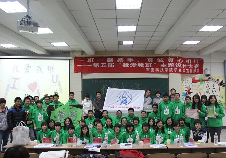 一班一路携手,真诚真心相伴。为了增强同学们的集体荣誉感,营造互助互爱的班级氛围,军需科技学院学生会宣传部于2013年11月12日在动物实验楼602举办第五届“我爱我班”主题设计大赛。莅临本次大赛的评委老师有:军需科技学院党委书记高福和,党委副书记梅士伟,农学部团委秘书郑蕊,军需科技学院学工办主任兼团委书记王丹,辅导员潘国庆、林滨渤,此外,本次大赛还有幸邀请到了两位班主任莅临现场担任嘉宾,他们是:2013级物流管理一班班主任赵中华,2013级农林经济管理班主任彭竞。