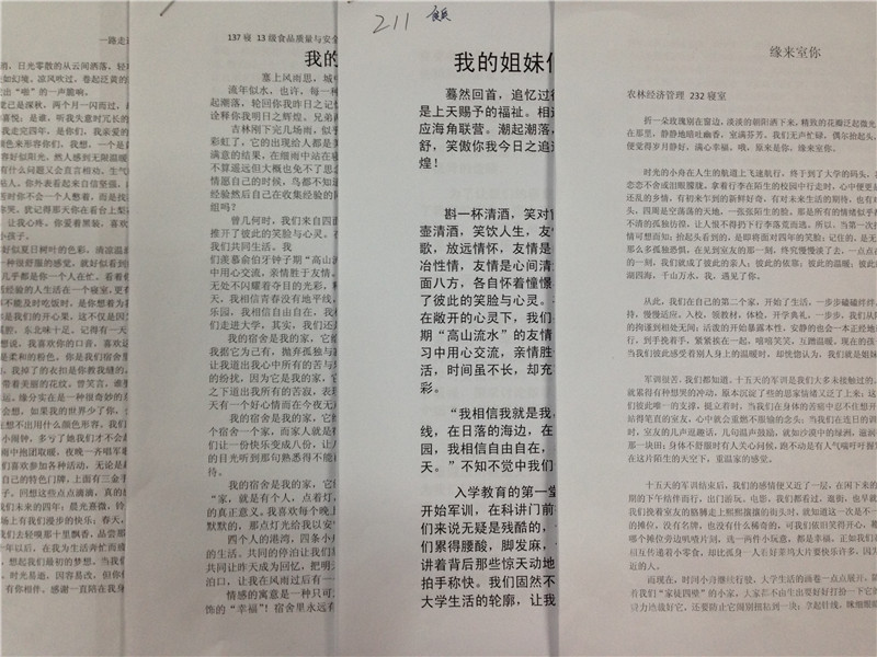 为了进一步加深室友之间的感情,弘扬和谐美好的寝室文化,彰显新一代大学生的团结力与凝聚力,吉林大学军需科技学院于2013年10月中旬举办寝室文化月活动,其中,由学院学生会学习部承办的寝室文化征文大赛现已圆满结束。