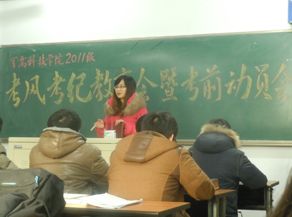 为加强学风建设,严肃考风考纪,增强学生的自律意识和责任意识,有效督促学生复习备考,2013年12月17日,军需科技学院在科学讲堂203召开2011级学生期末考风考纪教育会暨考前动员大会,2011级全体班委参加会议,会议由2011级辅导员金鑫老师主持。