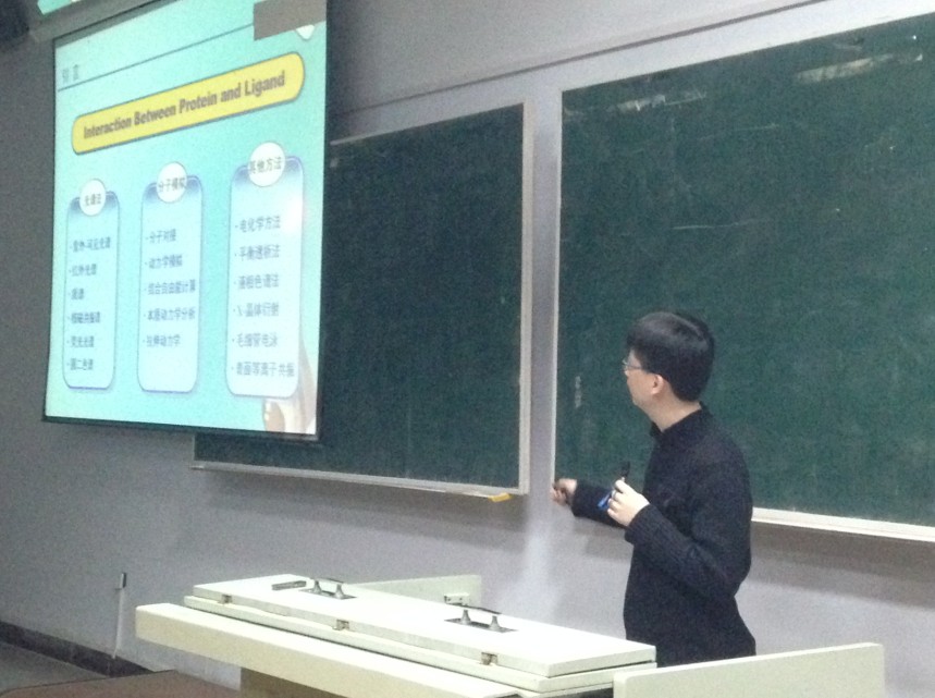 牛老师则以严谨的态度,为同学们普及和传授科学知识,用生动的事例带给大家一场科学盛宴,不仅重点讲述了研究小分子与蛋白质相互作用所用的光谱法、x射线晶体衍射法以及分子模拟方法,同时更是通过一系列分子模拟视频的展示和详尽系统的讲解,使同学们了解到了分子模拟方法的直观准确、简便省时的突出优点,了解了分子动力学模拟应用及研究进展,而讲座中阵阵的热烈掌声,则更是表达着同学们对牛老师的尊敬和喜爱,对学术科研的憧憬和向往。