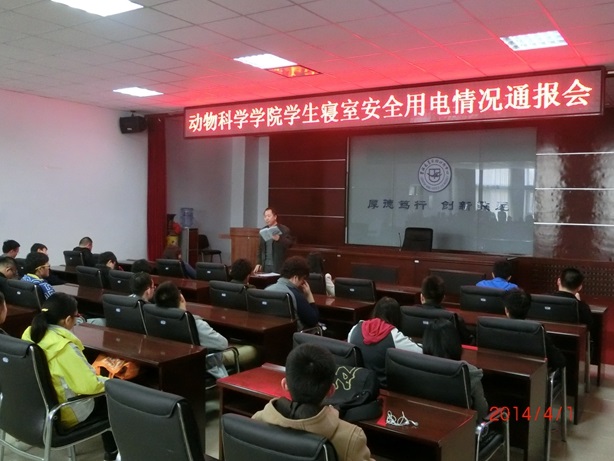 为了进一步了解学生在宿舍的生活情况,增强学生的宿舍安全意识,消除安全隐患,维护校园安全。动物科学学院于4月1日上午开展了新学期首次寝室安全用电突击检查活动,学院党委副书记曹伟光、学办主任于丹丹、辅导员肖建荣和张文浩四位老师在学生骨干的陪同下对11级和12级和13级学生宿舍进行了细致的卫生安全检查。并于当天下午召开了安全用电情况通报大会。