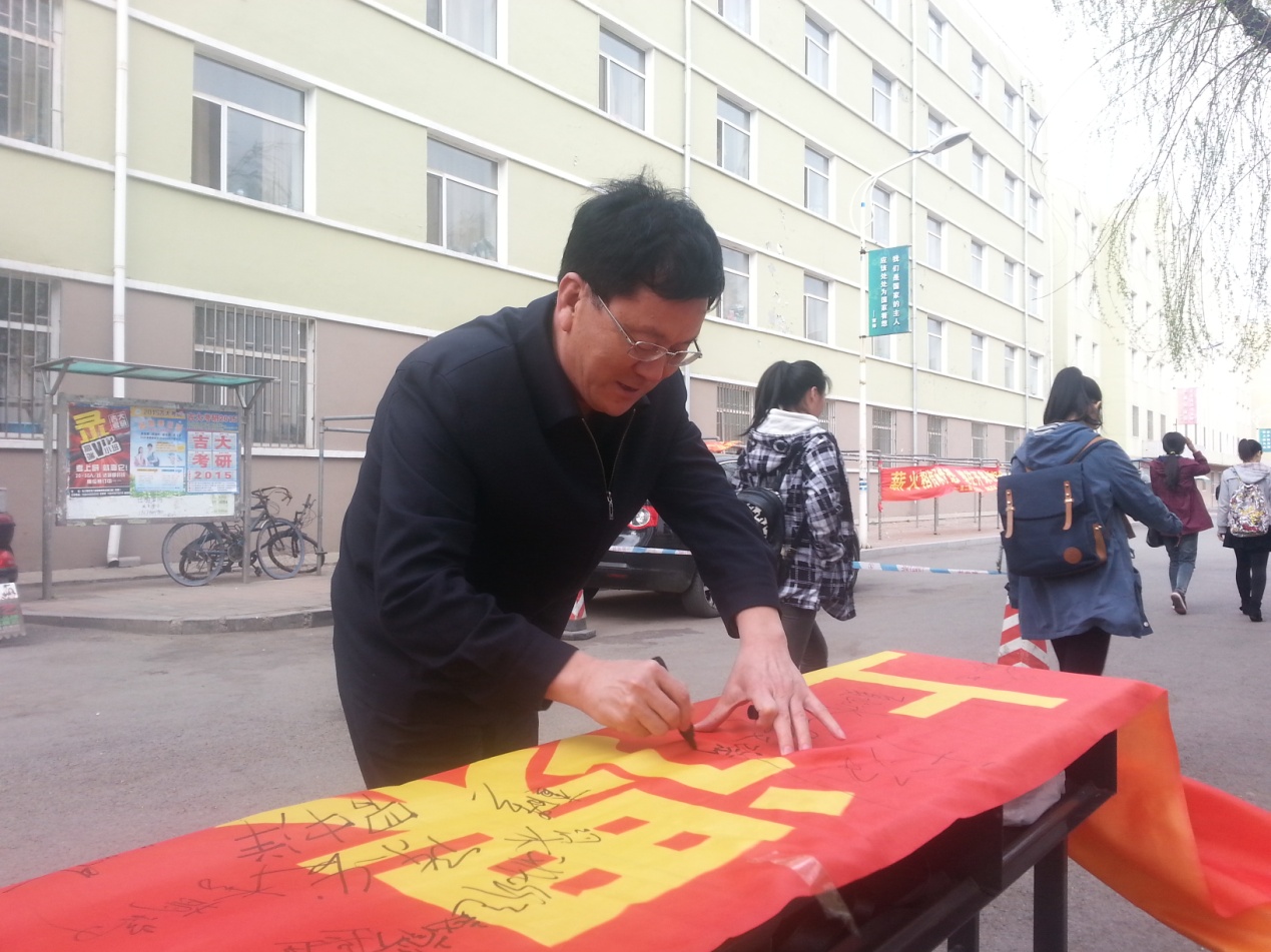 4月20日,物一团支部首先在农学部五号公寓门前开展了“上课,请关手机”签名倡议活动。“上课,请关手机”鲜亮的横幅吸引了很多同学驻足观看,不少同学深有感触,纷纷在横幅上签了字,表示自己“上课戒手机”的决心。当日傍晚,正在考查校园建设的农学部韩文瑜学部长看到了横幅,欣然签名,给予鼓励。学校心理发展中心何思彤老师、军需科技学院党委副书记梅士伟、团委书记王丹等老师也分别在条幅上签名表示对活动的支持。