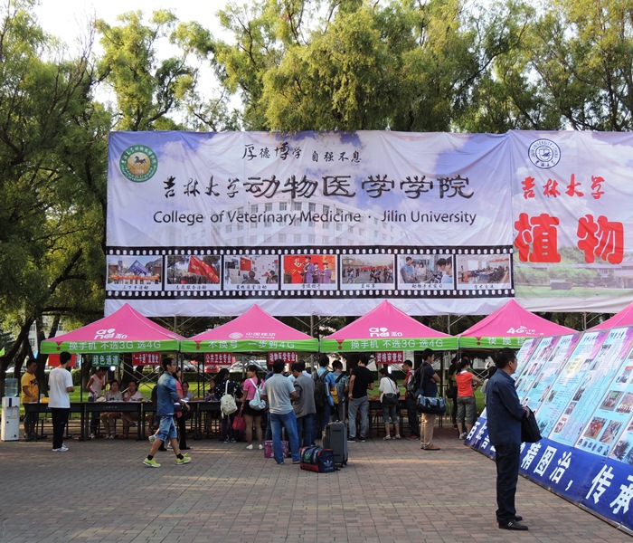 在这秋风送爽丹桂飘香的美好时节,吉林大学动物医学学院有序开展了2014级新生的迎接工作。8月29日下午,动物医学学院学生会在学院党委副书记饶家辉老师、团学办主任董兵老师、辅导员谭瑶老师、新生辅导员周靓老师以及动物医学学院学生会主席石俊超的领导和指挥下,在科学讲堂门前布置了迎新现场,为迎新工作地顺利开展打下坚实的基础。