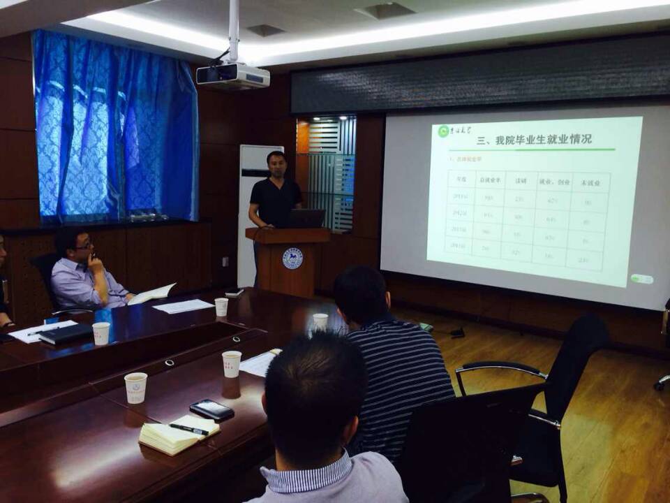 首先,由饶家辉副书记向大家介绍了学院近五年本科生报到人数和调剂人数的比例变化,动物医学专业的调剂率首次降低到49.3%;其次对学院不同年级学生的挂科率、学业预警率、英语等级考试一次性通过率等指标进行深入的比较和分析,提出学生存在英语弱、动手能力不强、执业兽医师通过率不高等问题;对学院2013届和2014届毕业学生就业率、推免率和读研率等进行分析,指出应拓宽学生的就业渠道,鼓励学生到动物医院就业,提高学生读研率、出国率等对策办法。