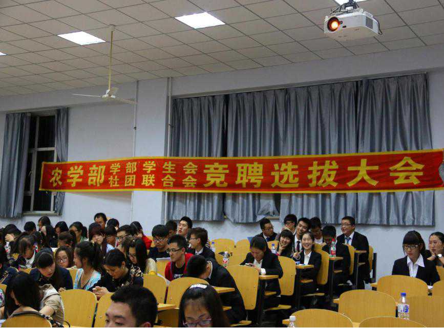 秋风飒爽,金菊飘香。2014年9月18日晚,和平校区第十一届学生会、第九届学生社团联合会主席团换届竞选大会在科学讲堂100顺利举行。西区学生办公室主任邵俊涛、动物医学学院团委书记董兵、植物科学学院团委书记曾光、军需科技学院2011级辅导员金鑫,动物科学学院团委书记于丹丹、原农学部团委秘书郑蕊、西区学生办秘书梅娜、第十届学生会主席阮黎靖及主席团其他成员、第八届学生社团联合会主席孙佳玉及主席团其他成员担任了本次大会的评委。此外,第十届学生会全体成员、第八届学生社团联合会全体成员、各学院学生会主席团以及部分社团代表也参加了本次换届竞聘大会并担任大众评审。