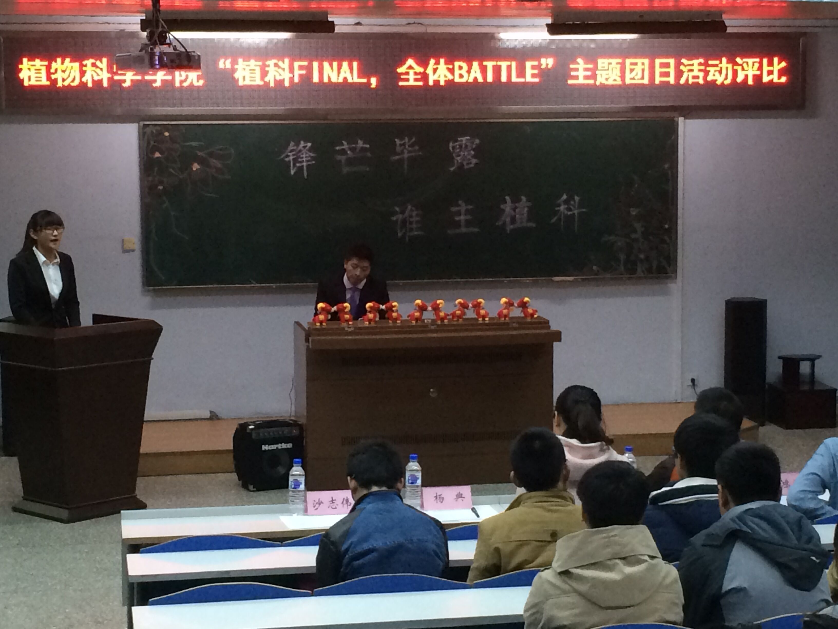 为了检验植物科学学院2014级各个班级在“植科FINAL,全体BATTLE”主题团日活动中的成果,植物科学学院团委学生会组织部主办的“植科FINAL,全体BATTLE”主题团日活动评比于3月19日在农学楼二楼多功能报告厅拉开序幕。