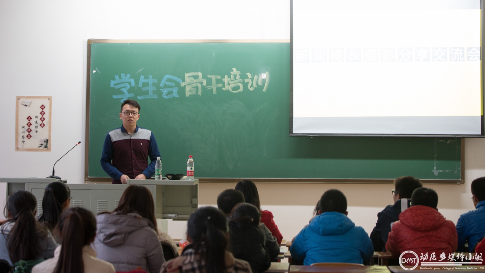 为了切实加强学生会新晋骨干的工作能力,培养同学们撰写新闻稿的兴趣,提高办事效率,出色的完成任务。动物医学学院学生会于11月3日下午三点半在李四光楼313教室举行了有关新闻稿撰写及摄影技巧方面的培训 ,本次培训由2012级王海豫学长主讲。
